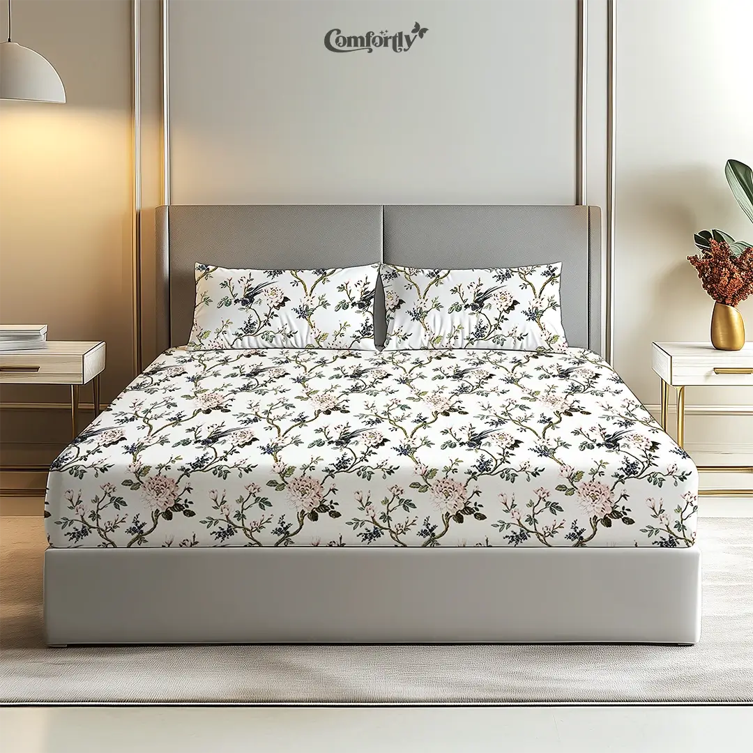 Make your bedroom a peaceful retreat with the Birdsong Blossom 100% Cotton King Size Fitted Bedsheet. Designed for effortless fitting and everyday comfort, this bedsheet offers a snug, wrinkle-free look that stays in place all night. Crafted from breathable cotton with a vibrant floral pattern, it adds a refreshing touch of nature-inspired elegance to your room decor.